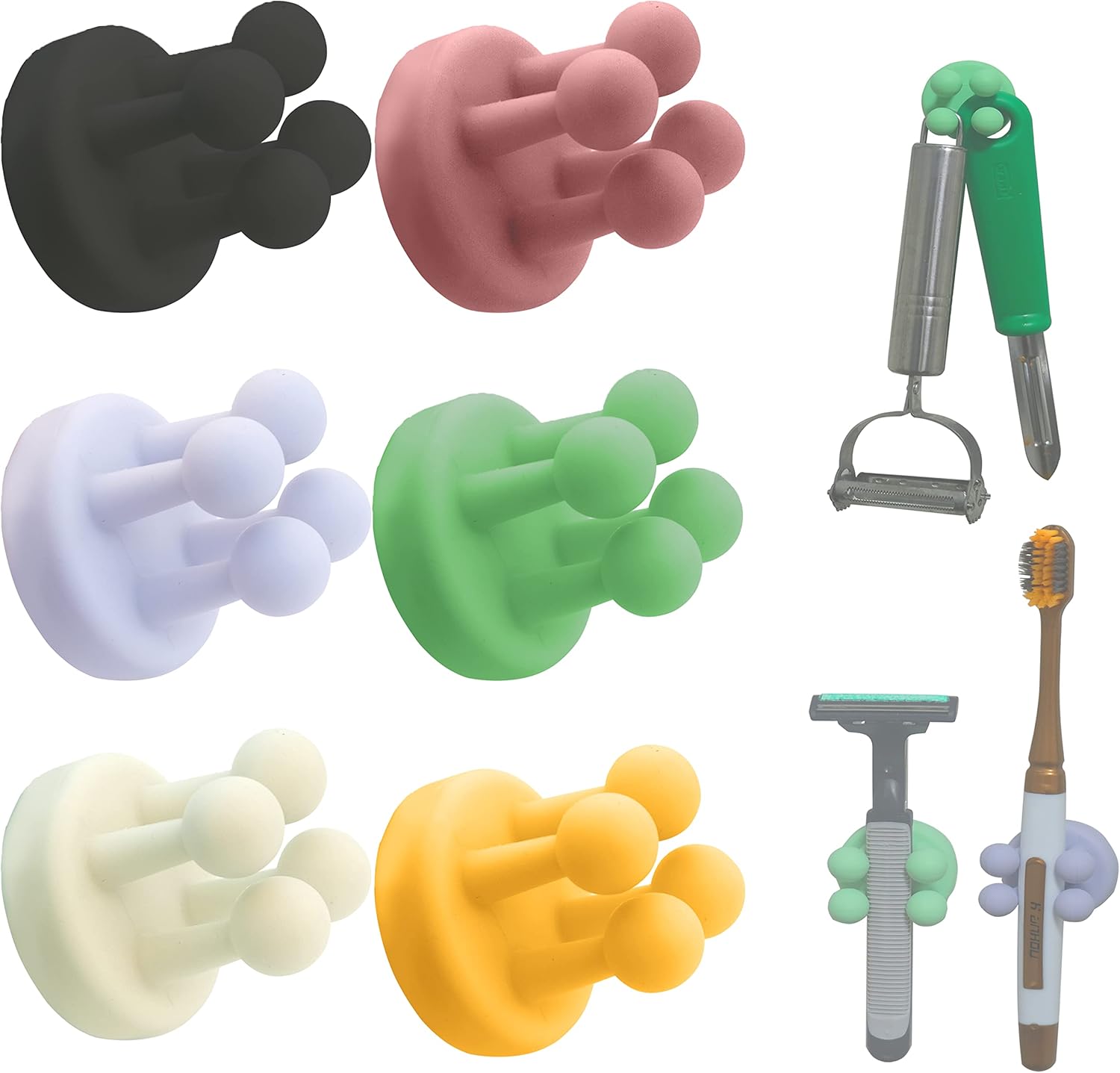 - 6 Pack Silicone Adhesive Hooks: With the help of these rubber hooks, in the bathroom, you can hold your toothbrush, manual razor, shower ball, towel, etc.; in the kitchen, you can hold your spoon, melon knife, rice spoon; in the bedroom, you can hold your charging head, keys, glasses; in the office, you can hold your mask, pen, data cable, etc.